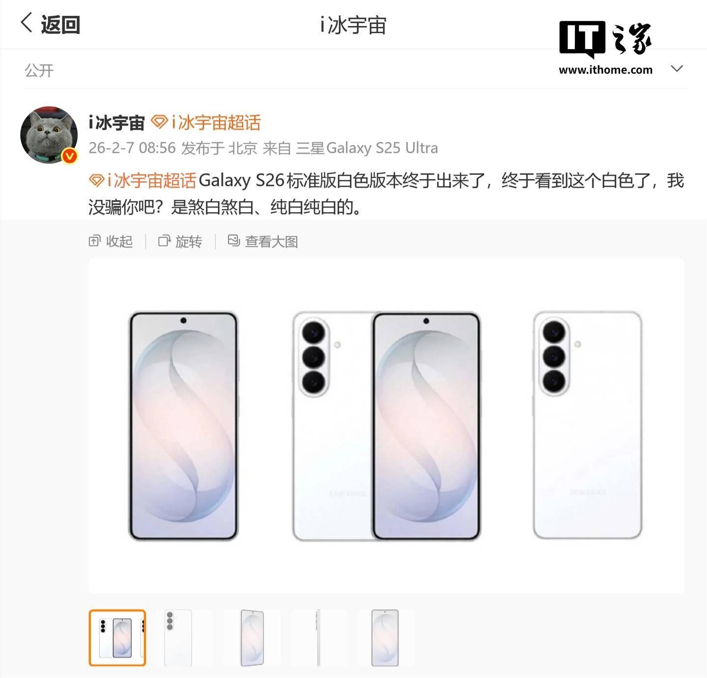 消息源还分享了三星 Galaxy S26 标准版白色渲染图: