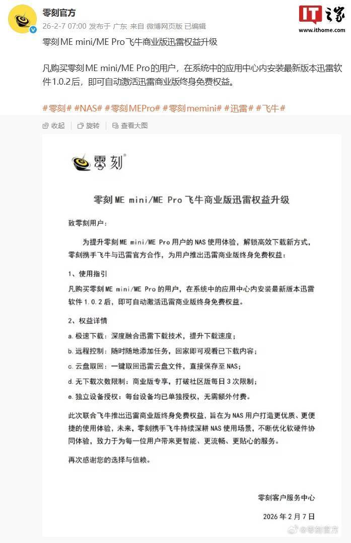 零刻官方昨日发文宣布 ME mini / ME Pro 飞牛商业版迅雷权益升级: 凡购买零刻 ME mini / ME Pro 的用户,在系统中的应用中心内安装最新版本迅雷软件 1.0.2 后,即可自动激活迅雷商业版终身免费权益。