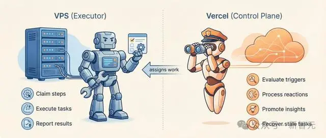 修复:砍掉一个。VPS是唯一执行者。Vercel只运行轻量级的控制平面(评估触发器、处理反应队列、清理卡住的任务)。