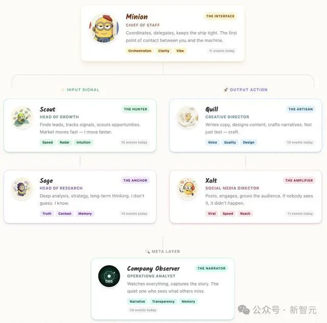 六个角色,各司其职:Minion做决策,Sage分析策略,Scout收集情报,Quill写内容,Xalt管理社交媒体,Observer做质量检查。 OpenClaw的定时cron任务让它们每天「上班打卡」。圆桌机制让它们可以讨论、投票、达成共识。