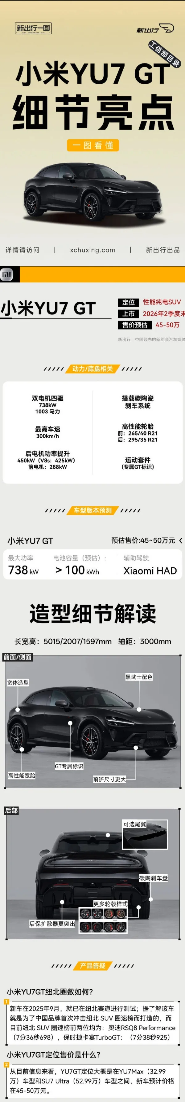 在智能化与实用性方面,小米YU7 GT同样表现不俗。该车型将搭载宁德时代的三元锂电池组,支持双向快充。售价方面,虽然官方尚未定价,但上述博主认为新车定位可能在YU7 Max(32.99万元)和SU7 Ultra(52.99万元),预计价格为45万-50万元。