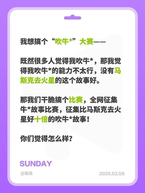 今日稍早前,俞浩称自己想搞个“吹牛*”大赛,全网征集牛*故事比赛,征集比马斯克起火星好十倍大吹牛*故事。