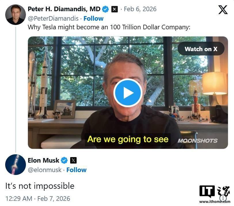 目前市场上有大量特斯拉多头,对该公司抱有极高的预期,尤其是在其业务版图早已超越汽车与能源领域、正式进军人工智能和机器人技术之后。 不过,部分最为乐观的特斯拉投资者认为,这家公司的市值有望达到 100 万亿美元(IT之家注:现汇率约合 694.34 万亿元人民币);而首席执行官埃隆・马斯克也表示,尽管这一数字听起来近乎荒谬,但并非完全不可能。 作为参考,当前全球市值最高的十家公司 —— 英伟达、苹果、Alphabet(谷歌母公司)、微软、亚马逊、台积电、Meta、沙特阿美、博通以及特斯拉,总市值合计约为 26 万亿美元。 方舟投资(ARK Invest)的凯西・伍德认为,考虑到特斯拉在多个行业的长远布局与雄心,这一估值是合理的:“…… 在人工智能领域,想要胜出需要具备什么?你必须拥有专属数据。想想他手中掌握的各类独家数据:特斯拉拥有道路场景相关数据,脑机接口公司 Neuralink 拥有多组学数据,这些都是别家没有的;X 平台的数据同样独一无二。我完全可以预见 100 万亿美元的市值,我认为这会实现,原因就在于生态协同。基于我刚才所说的理由,特斯拉是最有希望冲击这一市值的公司。” 马斯克在去年年底曾表示,他旗下所有公司似乎都在走向协同融合,而这一趋势已开始落地。特斯拉第四季度财报股东演示文件显示,公司已对 xAI 进行投资;不久前,SpaceX 又收购了 xAI,标志着马斯克旗下众多公司有望形成庞大商业生态的第一步。 随着这一进程逐步推进,马斯克对这一惊人估值的态度似乎更加积极。他在 X 平台上表示,100 万亿美元市值的想法“并非不可能”。 马斯克的表态,体现出他对旗下众多项目的信心,无论这些项目已步入成熟阶段,还是仍处于初期推进中。