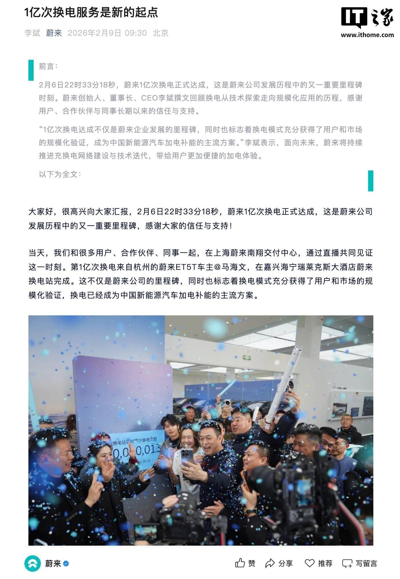 今天上午,蔚来创始人、董事长、CEO 李斌在蔚来汽车公众号发布长文称,2026 年计划新建 1000 座换电站,加电风景线增至 100 条,继去年 G318 川藏换电路线、滇藏换电路线贯通之后,今年将打通丝绸之路换电路线,不断拓展用户出行边界。今年第五代换电站即将开启大规模建设,firefly 萤火虫用户也很快将享受到便捷的换电体验。 李斌提到,2 月 6 日 22 时 33 分 18 秒,蔚来 1 亿次换电正式达成,这是蔚来公司发展历程中的又一重要里程碑,感谢大家的信任与支持。“从第 1 次到第 1 亿次,我们用了 2819 天。这条达成之路并不平坦。过去 11 年,我们坚持在充换电基础设施领域持续投入超过 180 亿元,布局超过 2100 项专利。” 李斌还表示,1 亿次换电,意味着换电完成从设想到规模化运行的验证。“今天,单日换电服务量已经突破 10 万次。换电模式的稳定、便利和长期价值得到用户的高度认可,换电正在成为中国新能源汽车加电补能的主流方案。这不是蔚来一家公司的努力,而是与用户、合作伙伴与产业共同推动的成果。” 据IT之家此前报道,2018 年 5 月,蔚来的首座换电站在深圳南山落成。以此计算,蔚来达成 1 亿次换电里程碑用了不到 8 年时间,年均换电超 1200 万次。第 1 亿次换电的车主为来自浙江杭州的马先生,他是 2025 款蔚来 ET5T 的用户,在浙江海宁进行了蔚来的第 1 亿次换电。李斌表示要在 App 中添加马先生,并赠送他 10 万积分。