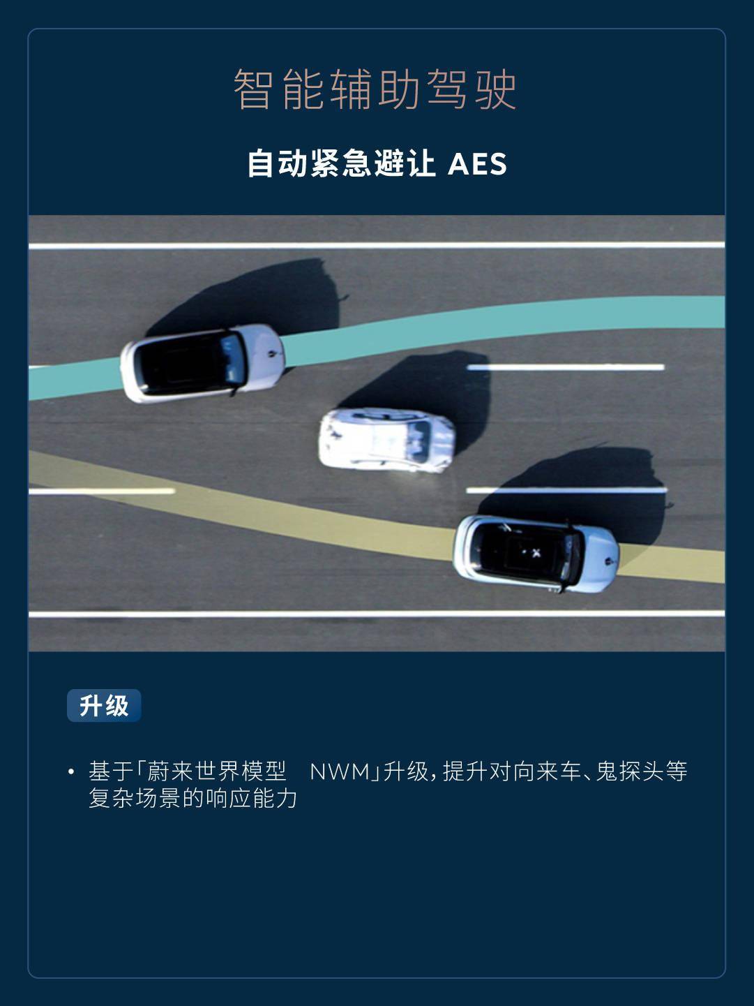 自动紧急避让 AES - 基于「蔚来世界模型 NWM」升级,提升对向来车、鬼探头等复杂场景的响应能力。