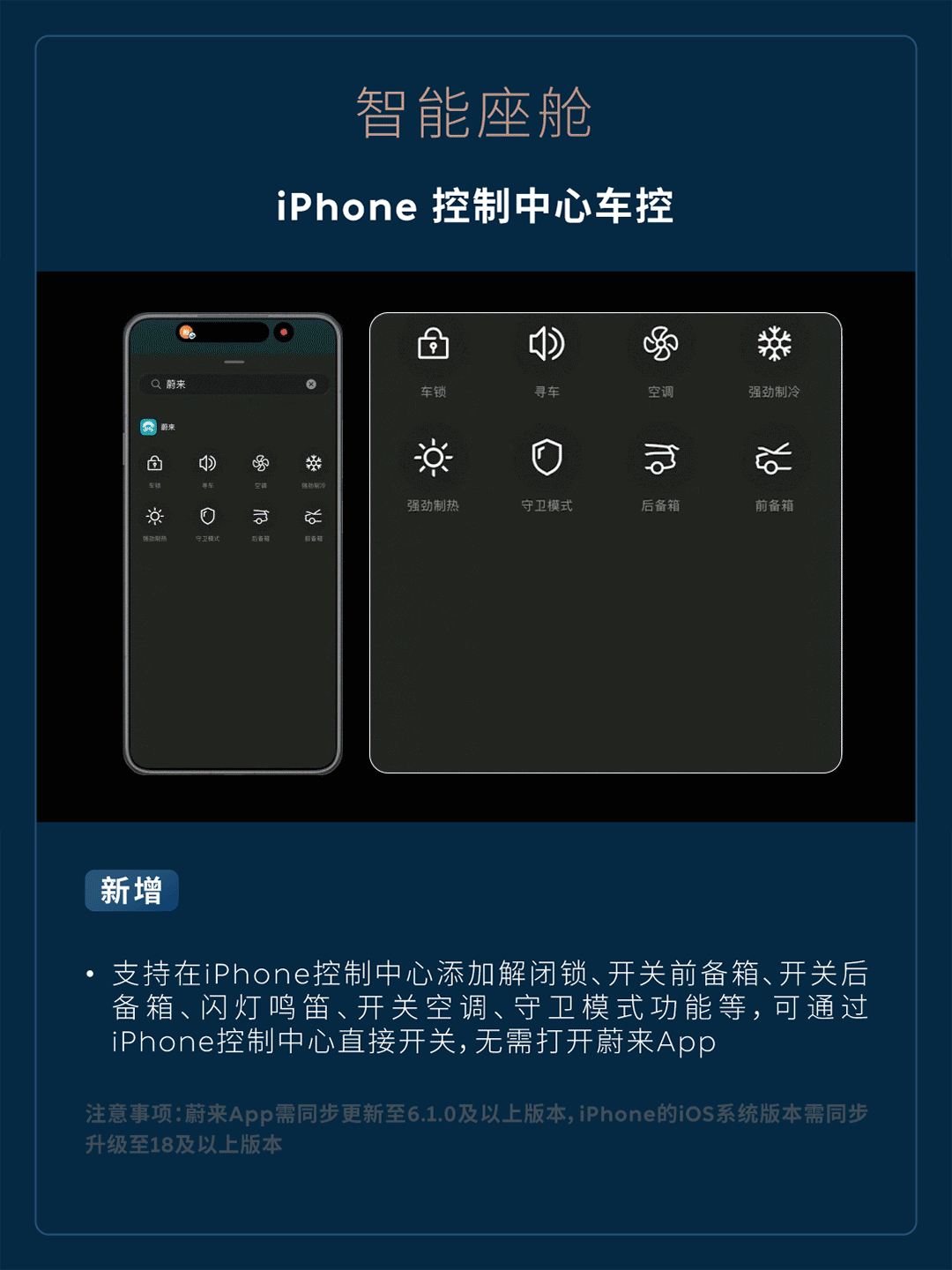 iPhone 控制中心车控 - 新增支持在 iPhone 控制中心添加解闭锁、开关前备箱、开关后备箱、闪灯鸣笛、开关空调、守卫模式功能等,可通过 iPhone 控制中心直接开关,无需打开蔚来 App(注意事项:蔚来 App 需同步更新至 6.1.0 及以上版本,iPhone 的 iOS 系统版本需同步升级至 18 及以上版本)。