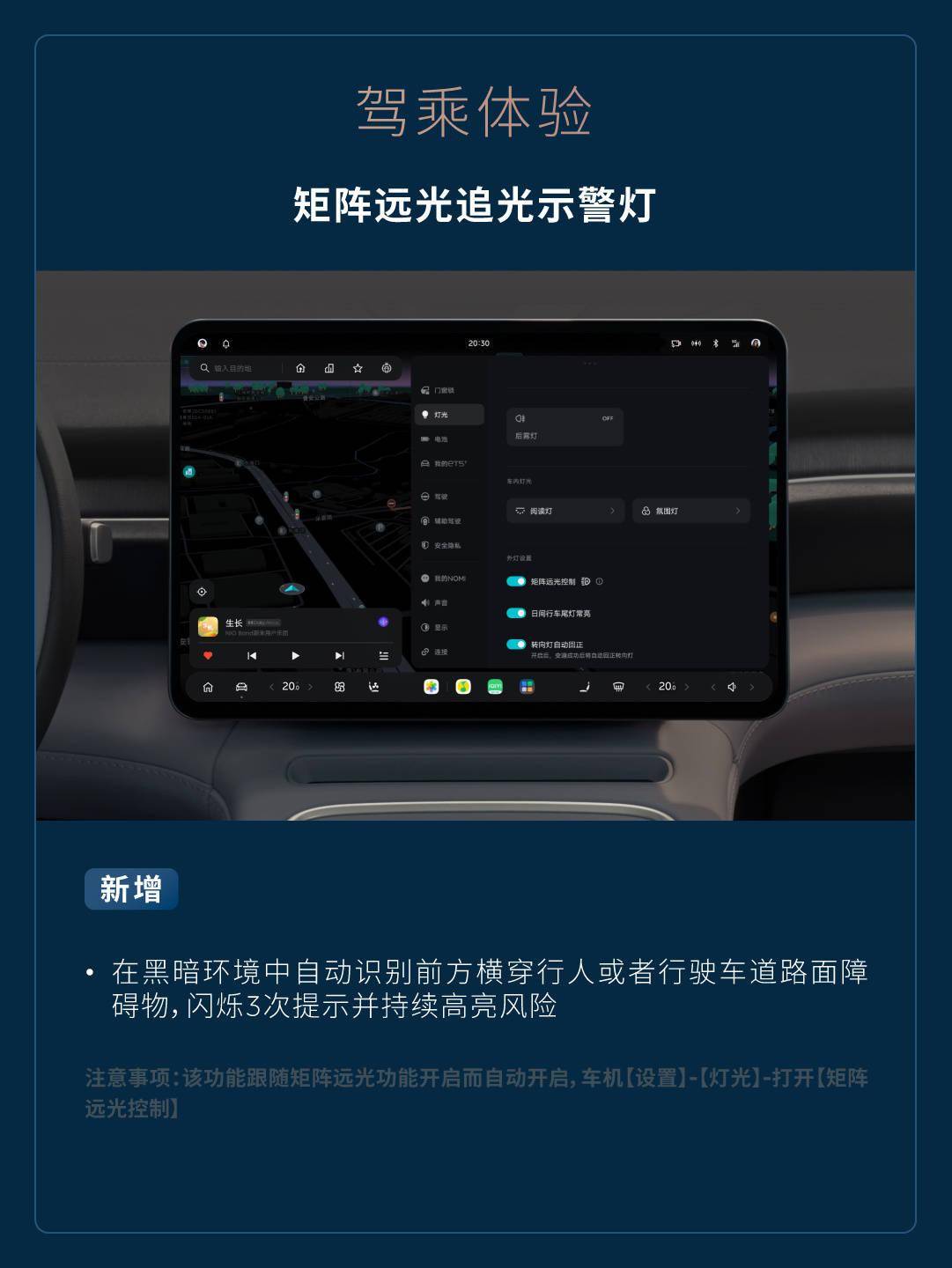 矩阵远光追光示警灯 - 在黑暗环境中自动识别前方横穿行人或者行驶车道路面障碍物,闪烁 3 次提示并持续高亮风险(注意事项:该功能跟随矩阵远光功能开启而自动开启,车机【设置】-【灯光】-打开【矩阵远光控制】)。