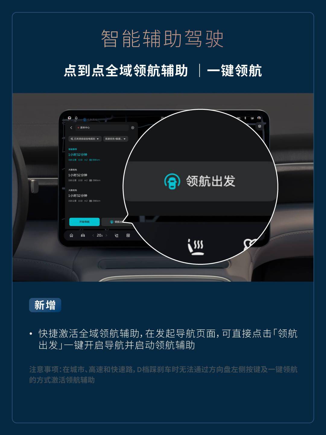 点到点全域领航辅助 | 一键领航 - 新增快捷激活全域领航辅助,在发起导航页面,可直接点击「领航出发」一键开启导航并启动领航辅助(注意事项:在城市、高速和快速路,D 档踩刹车时无法通过方向盘左侧按键及一键领航的方式激活领航辅助)。