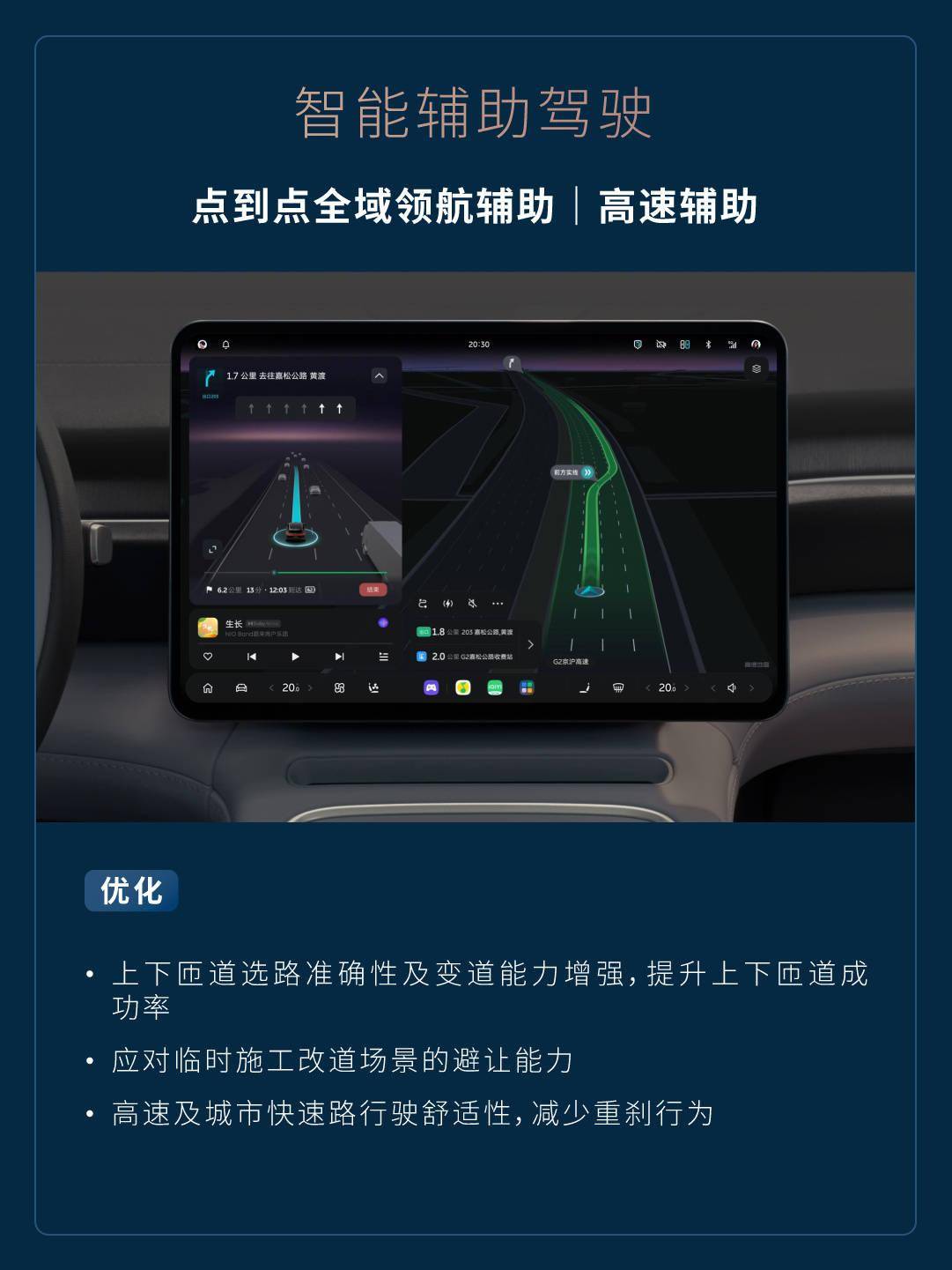 点到点全域领航辅助 | 高速辅助 - 上下匝道选路准确性及变道能力增强,提升上下匝道成功率。