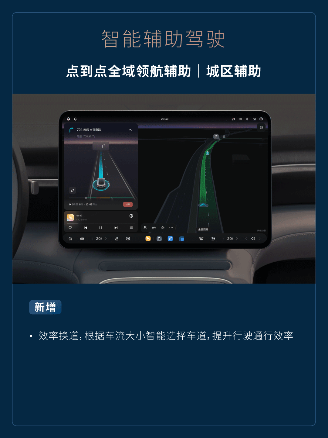 - 跟随导航路线车道选择能力提升,在通过连续路口时提前换道,更加合理选道。