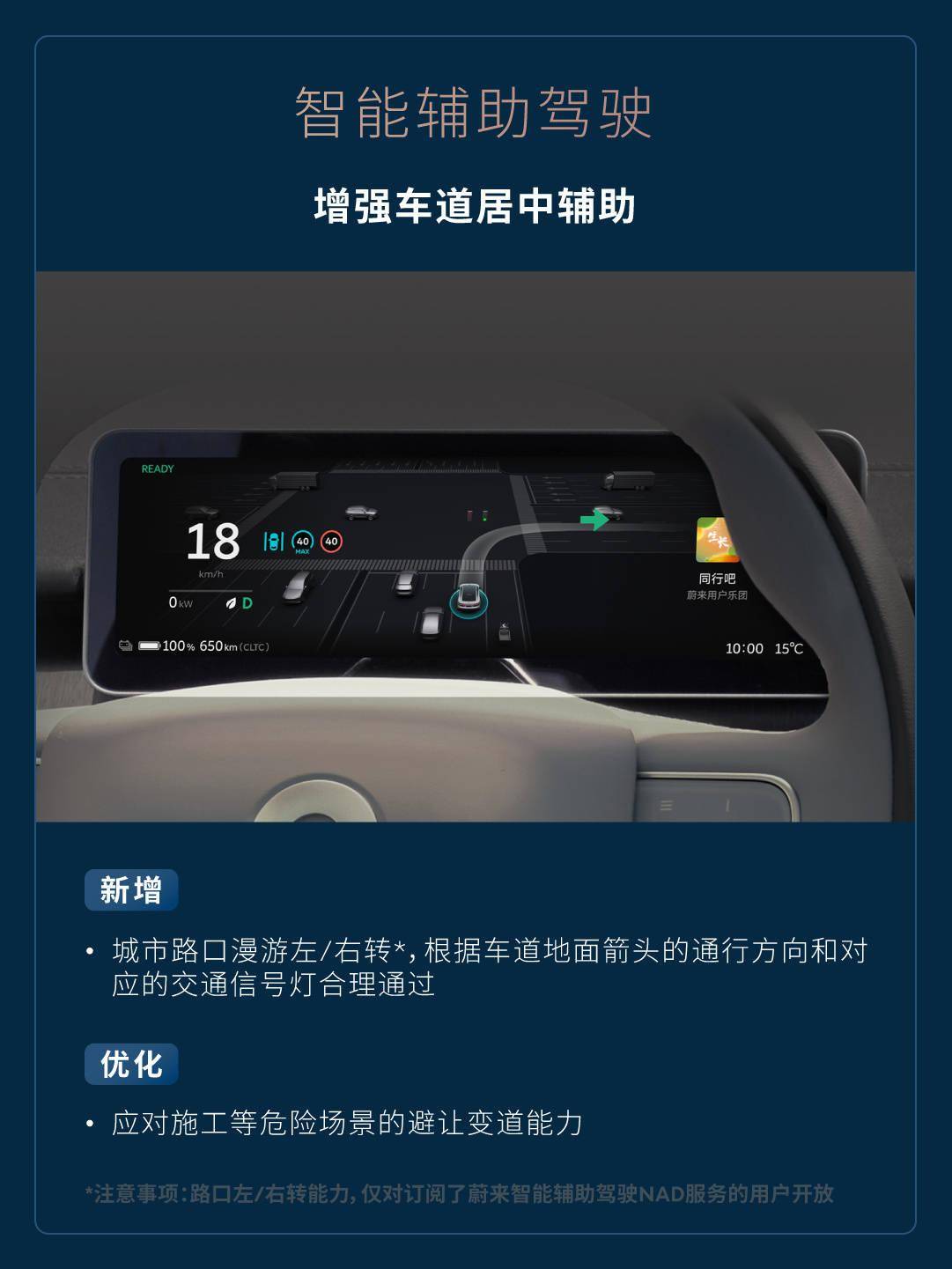 增强车道居中辅助 - 新增城市路口漫游左 / 右转,根据车道地面箭头的通行方向和对应的交通信号灯合理通过(注意事项:路口左 / 右转能力,仅对订阅了蔚来智能辅助驾驶 NAD 服务的用户开放)。