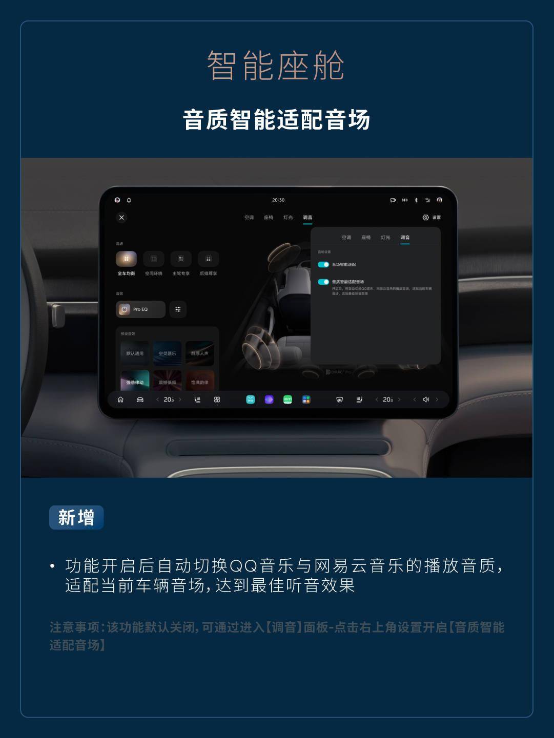 音质智能适配音场 - 新增功能开启后自动切换 QQ 音乐与网易云音乐的播放音质,适配当前车辆音场,达到最佳听音效果(注意事项:该功能默认关闭,可通过进入【调音】面板 - 点击右上角设置开启【音质智能适配音场】)。