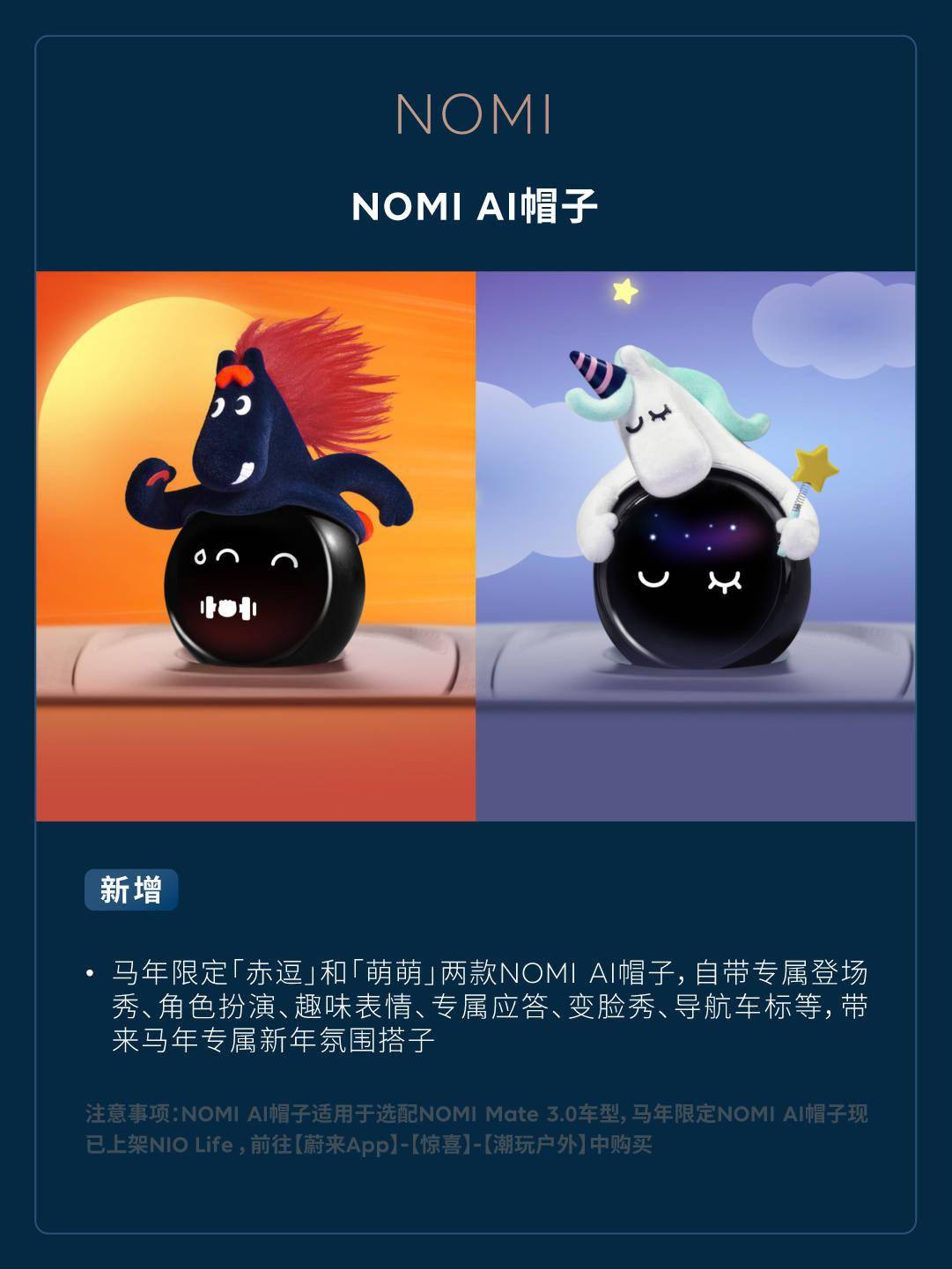 NOMINOMI AI 帽子- 新增马年限定「赤逗」和「萌萌」两款 NOMI AI 帽子,自带专属登场秀、角色扮演、趣味表情、专属应答、变脸秀、导航车标等,带来马年专属新年氛围搭子(注意事项:NOMI AI 帽子适用于选配 NOMI Mate 3.0 车型,马年限定 NOMI AI 帽子现已上架 NIO Life,前往【蔚来 App】-【惊喜】-【潮玩户外】中购买)。