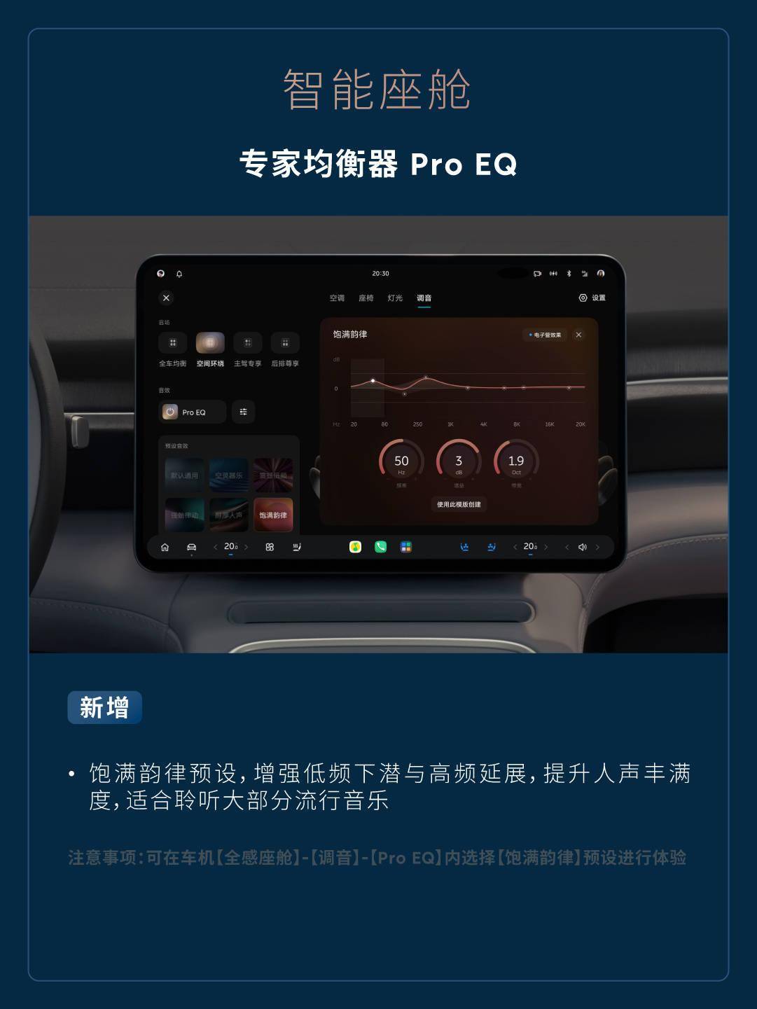 专家均衡器 Pro EQ - 新增饱满韵律预设,增强低频下潜与高频延展,提升人声丰满度,适合聆听大部分流行音乐(注意事项:可在车机【全感座舱】-【调音】-【Pro EQ】内选择【饱满韵律】预设进行体验)。