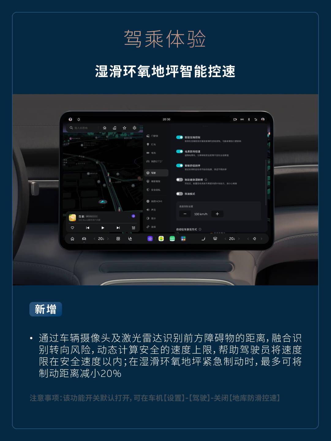 驾乘体验湿滑环氧地坪智能控速- 新增通过车辆摄像头及激光雷达识别前方障碍物的距离,融合识别转向风险,动态计算安全的速度上限,帮助驾驶员将速度限在安全速度以内;在湿滑环氧地坪紧急制动时,最多可将制动距离减小 20%(注意事项:该功能开关默认打开,可在车机【设置】-【驾驶】- 关闭【地库防滑控速】)。