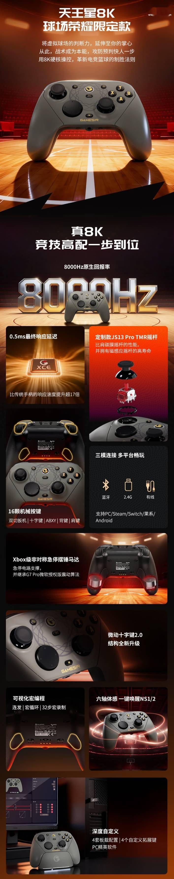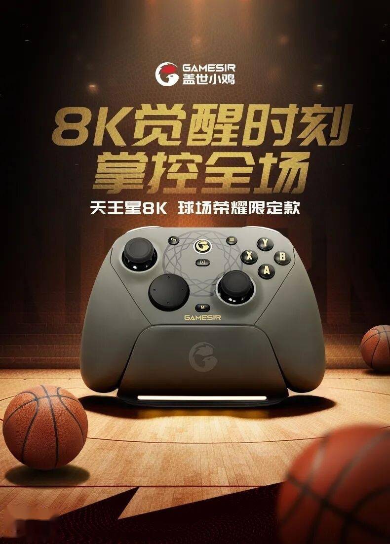 由盖世小鸡和 NBA2KOL2 合作打造,以天王星 8K 手柄为原型的「天王星 8K 球场荣耀限定款手柄」今日正式开售,售价 499 元。盖世小鸡表示,本次联名合作,是双方以专业共创赋能玩家热爱的全新尝试,当中融入了非常多的创意与巧思。 IT之家了解到,天王星 8K 在 USB 有线与 2.4GHz 无线模式下均支持 8000Hz 回报率,有线模式全链路延迟≈0.5ms,此外其还支持蓝牙无线连接,内置 1200mAh 电池。 该手柄配备旋转寿命 5M 的定制款控银 JS13 Pro TMR 摇杆,整体配备 16 颗机械按键,D-Pad 十字键标配三种不同类型的键帽,扳机支持机械微动 / 霍尔效应传感器双切,ABXY 按键采用光学微动,提供两颗微动小肩键和两颗带硬件锁的背键。 其拥有非对称急停摆锤马达,支持 1000Hz 六轴体感,握把背面包胶,三块式的面盖支持拆卸;提供 3.5mm 耳机插孔,标配 3m USB Type-C 480Mbps 数据线和可拆卸的 USB 线固定器,随附智能启停充电底座。