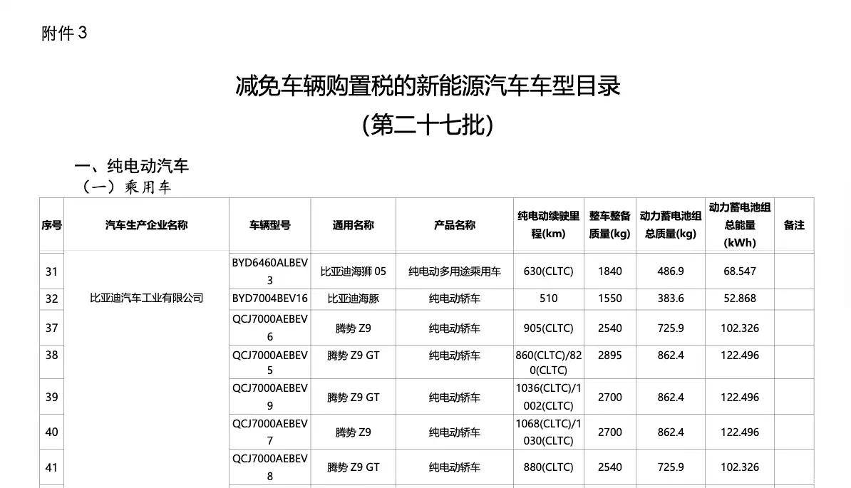 工信部发布的《减免车辆购置税的新能源汽车车型目录(第二十七批)》披露了新款腾势 Z9 及腾势 Z9GT 的申报信息。 IT之家注意到,申报信息显示,新款腾势 Z9 将换装 102.326kWh 和 122.496kWh 两种规格电池组,CLTC 工况下纯电续航里程分别达到 905km、1068km 及 1030km。同期申报的新款腾势 Z9GT 同样搭载上述两种电池容量,CLTC 纯电续航里程为 820km、860km、880km、1002km、1036km。 腾势 Z9GT 基于“易三方”整车智能控制平台打造,提供纯电与插混两种动力形式。动力方面,新款腾势 Z9 与 Z9GT 均申报了单电机版本,最大功率 370kW;Z9GT 额外提供高功率三电机版本,电机输出功率分别为 230kW、310kW 及 310kW。插混版车型配备 63.82kWh 电池组,WLTC 纯电续航 301km,CLTC 工况下纯电续航超 400km。 结合官方发布的图片资料,新款腾势 Z9GT 在智能驾驶硬件布局上进行调整,将激光雷达位置上移至车顶,并增设智驾状态指示灯。外观设计延续“优雅之势”家族语言,采用双星冕前灯组设计,搭配造型独特的进气口,强化运动属性。新车新增 21 英寸低滚阻静音轮圈、一体式运动座椅及熔岩红内饰配色,并推出全新峡湾绿外观色。 车身尺寸方面,新款腾势 Z9GT 长宽高分别为 5195(5180)/1990/1480(1500)mm,轴距 3125mm。车尾采用高辨识度尾灯设计,配备主动式与固定式双扰流板,下包围层次丰富。
