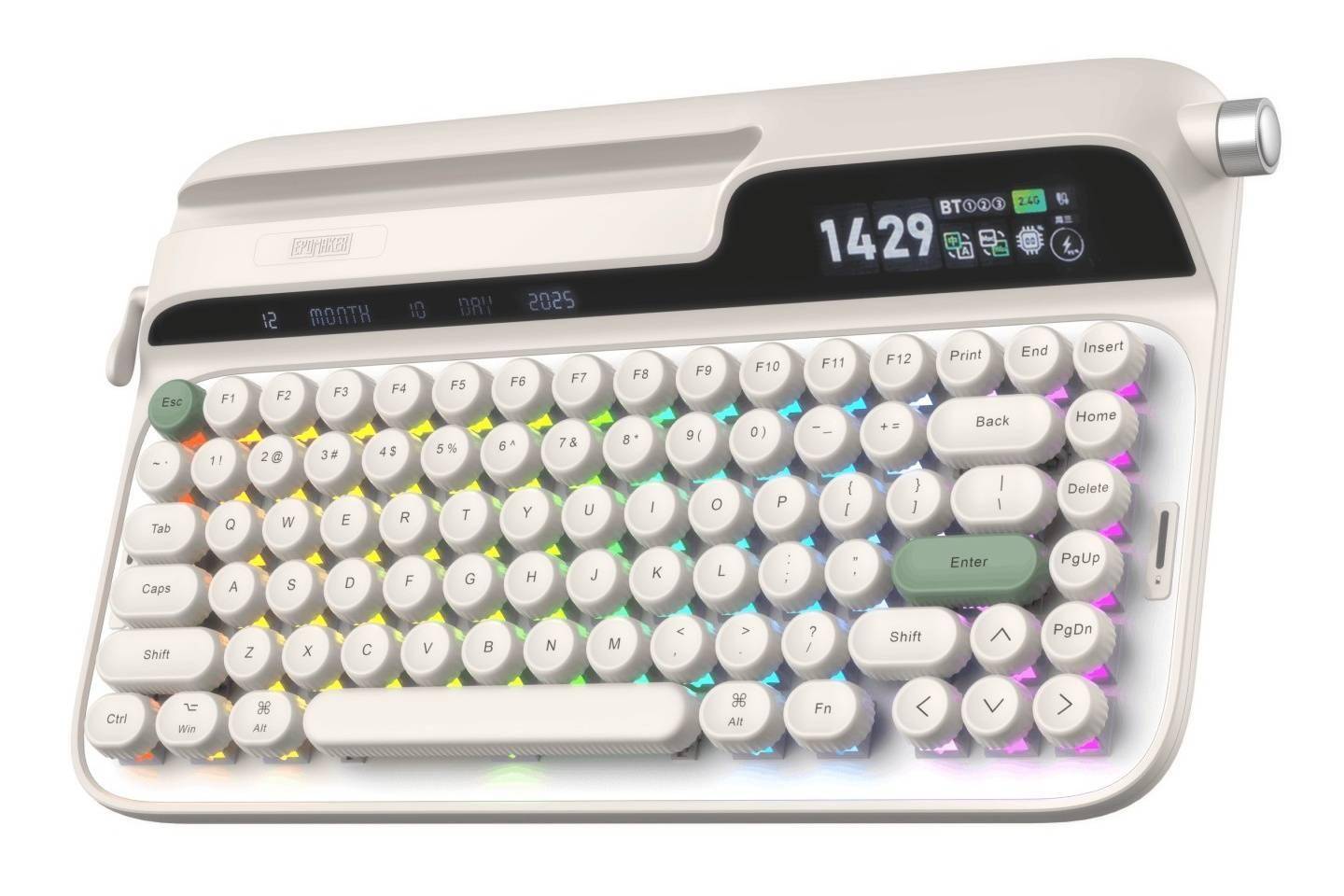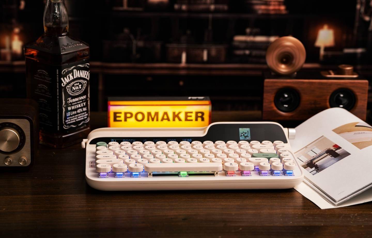 EPOMAKER 现已在官方店铺上架三模机械键盘 Glyph。这一型号在造型上采用致敬打字机的复古设计,搭配圆形 PBT 材质热升华工艺键帽,到手价 699 元。 EPOMAKER Glyph 采用 84 键配列,上部拥有双区多功能显示屏和用于放置智能手机或小型平板电脑的凹槽;机身左侧是回车、空格双功能摇杆,右侧则配备旋钮;后方拥有氛围灯带。 这款造型独特的键盘内部采用 TOP 固定结构,内置 5 层吸声填充,PCB 支持轴体热插拔与下灯位 RGB 背光,搭载线性手感的紫藤花轴。其支持 1000Hz 回报率,内置 8000mAh 电池。