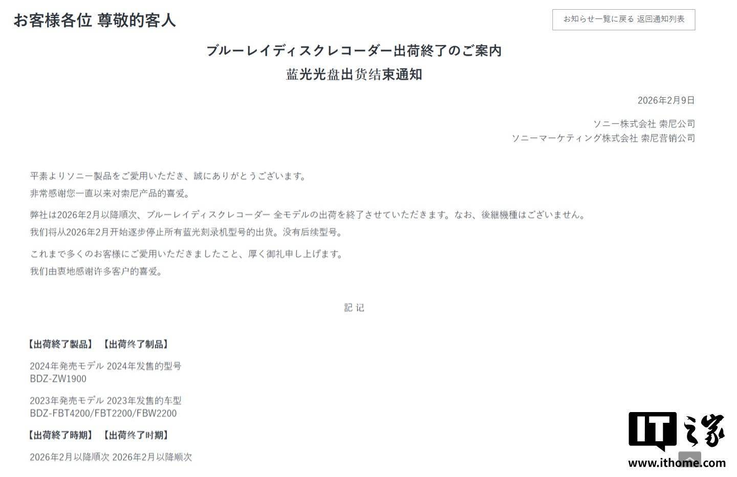 作为蓝光光盘标准的开创者与奠基人,索尼于当地时间 2 月 9 日在其日本官方网站发布公告,宣布将逐步停止旗下所有蓝光录像机的出货。更令人唏嘘的是,官方公告中明确标注“无后续机型”,这意味着索尼将彻底退出家用蓝光录像机硬件市场。 IT之家注意到,此次停产名单涵盖了 2024 年才推出的 BDZ‑ZW1900,以及 2023 年上市的 BDZ‑FBT4200、FBT2200、FBW2200 等机型,意味着就连近年发布的新款机型也将一同退出历史舞台。 早在 1998 年,索尼就率先将蓝紫色半导体激光器应用于光盘介质,并在 2003 年推出全球首款消费级蓝光播放器。同年,索尼投入大量资源为 PlayStation 3 搭载蓝光光驱,最终在标准之争中击败由东芝主导的 HD‑DVD,确立蓝光光盘作为高清物理介质的主流地位。 然而,随着在线流媒体视频的崛起,物理光盘市场急剧萎缩。松下早在 2023 年 2 月就宣布停产录像用蓝光光盘,而索尼也从 2025 年 2 月起停止刻录光盘的生产。如今,连“播放与录制”的硬件也宣告落幕,标志着整个生态已难以为继。 尽管我们早就知道实体 CD 正在走向衰落,但由“蓝光之父”索尼亲自拉下帷幕,依然具有极强的象征意义。这折射出两个残酷现实: 录像文化的消失:日本市场过去习惯录制电视节目并刻录成光盘保存的习惯,在点播回看(如日本 OTT 平台 TVer)与订阅式流媒体服务普及后,已不再是刚需。 物理介质转向收藏化:未来,蓝光光盘(乃至 4K 超高清蓝光)将成为少数发烧友的“收藏品”,而非面向大众的“消费品”。 对于仍收藏大量稀有光盘的游戏玩家而言,现在或许是入手备用机,或是转向游戏主机(如 PS5、Xbox)作为最后播放设备的时机。