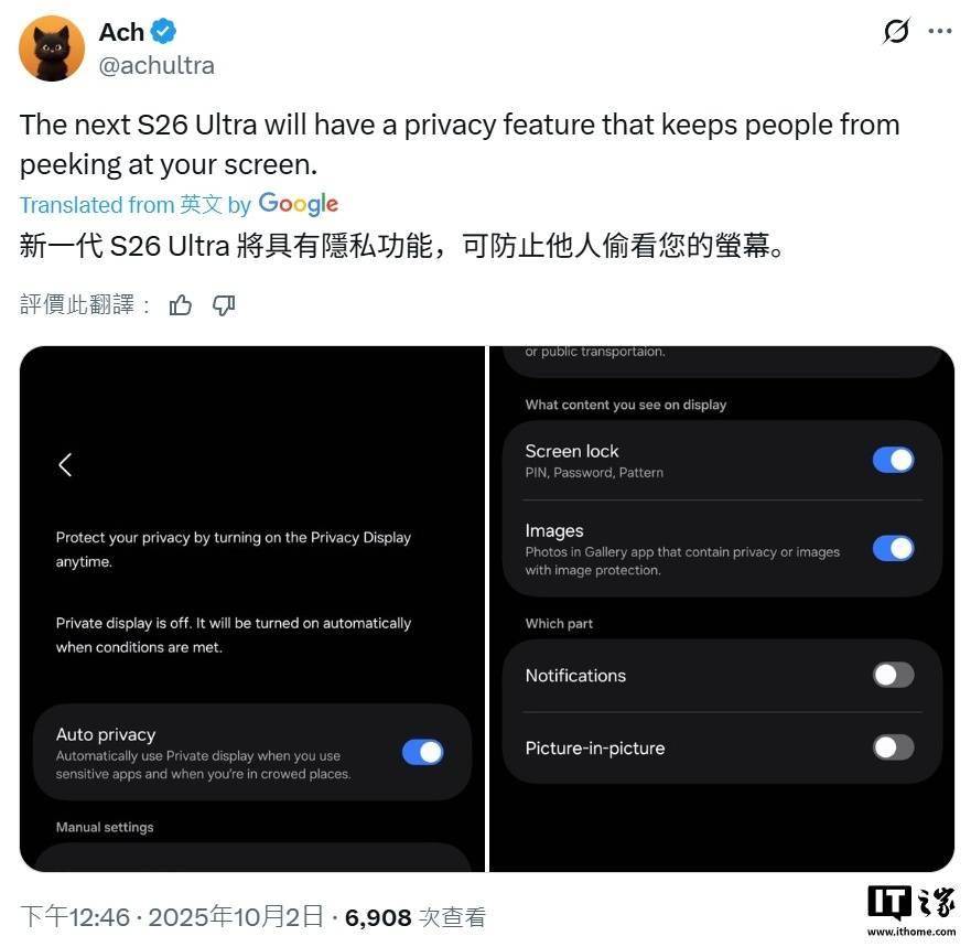结合IT之家上月报道,三星已确认下一代旗舰智能手机将搭载全新的隐私保护功能。业界普遍认为,这就是此前多次曝光的“隐私显示屏”(Privacy Display)功能,预计将随 Galaxy S26 Ultra 一同亮相。