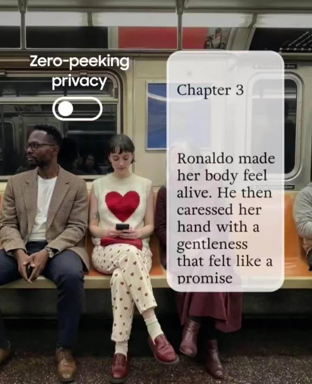视频内容显示,一名女性正在纽约地铁上用手机阅读电子书,而她左右两侧的乘客却在不断偷窥她的屏幕,不过这名女子并未表现不满,而是打开了“隐私屏”开关,随后屏幕从侧面视角变成完全黑屏,旁边的人也识趣地移开目光。
