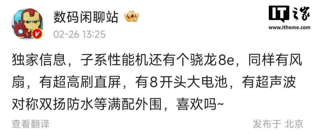 数码闲聊站 今日爆料称,某厂子系性能机搭载骁龙 8 至尊版处理器,同样有风扇、超高刷直屏、超 8000mAh 大电池、超声波指纹、对称双扬、防水等满配外围。 目前尚不清楚这款新机的具体型号。值得一提的是,本月早些时候还有一款天玑 9500 性能机被曝光。消息称某厂子系天玑 9500 工程机测试 0815± X 轴马达,联名调音双扬声器是对称方案,搭载 3D 超声波指纹,支持 IP68/IP69 满级防水,该机被外界看作为小米 REDMI K90至尊版。 至于这两款新机之间有什么联系?是否会同期发布?目前还不得而知,感兴趣的朋友可以关注IT之家后续报道。