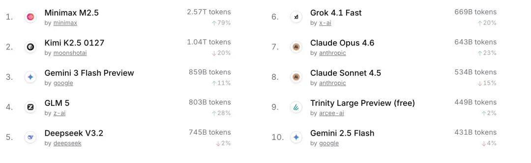 在OpenRouter上周榜单中,MiniMax、月之暗面、智谱、DeepSeek四家中国公司的模型均位列前五,其中MiniMax凭借2.57万亿tokens调用量位列第一。