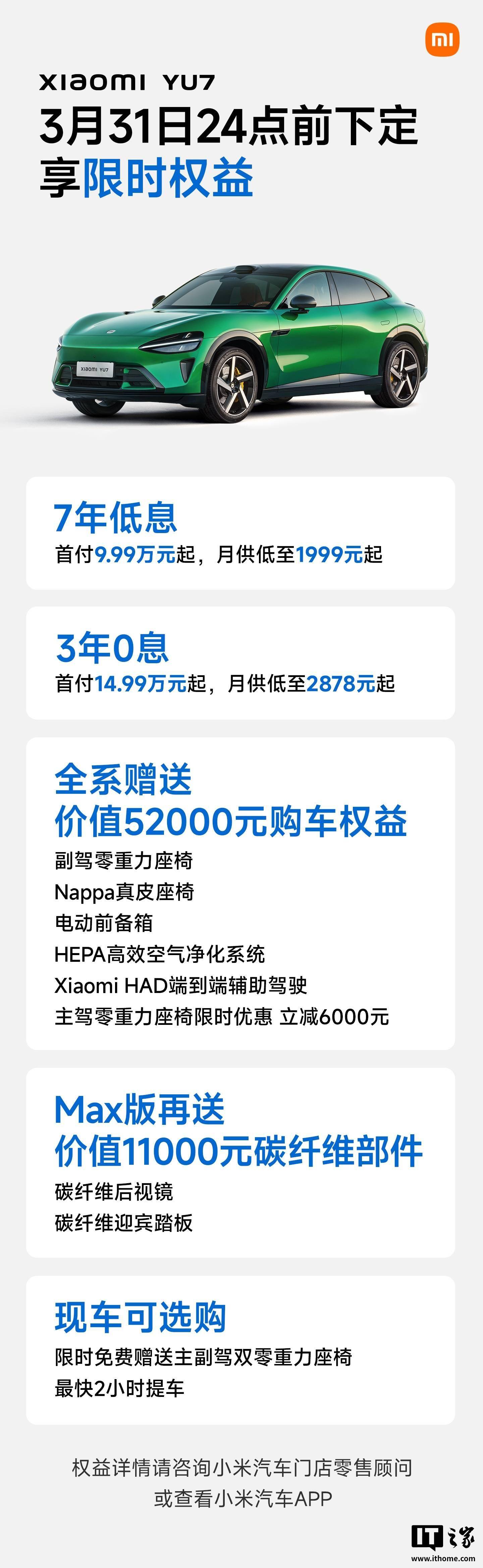 小米汽车官方今日公布了 YU7 和 SU7 Ultra 汽车的 3 月购车权益: 小米 YU7 - ①可享 7 年低息,首付 9.99 万元起,月供最低不到 2000 元,另有 3 年 0 息可选;