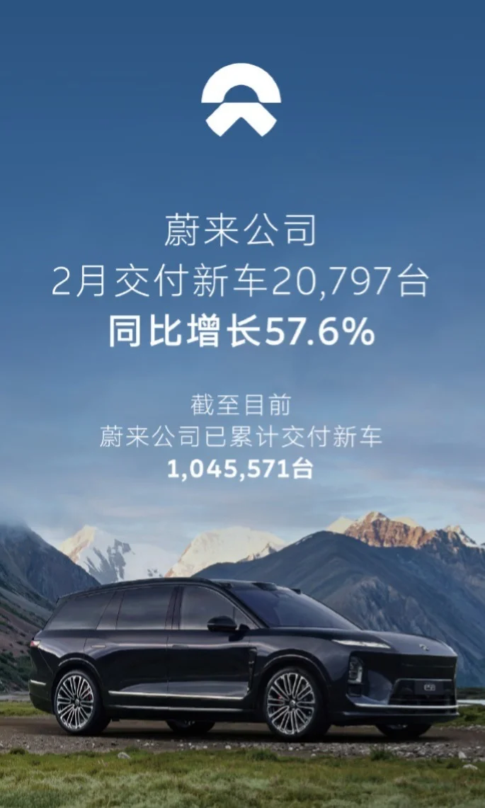 凤凰网科技讯 3月1日,蔚来公司宣布2月交付新车20,797台,同比增长57.6%。截至目前,蔚来公司已累计交付新车1,045,571台。