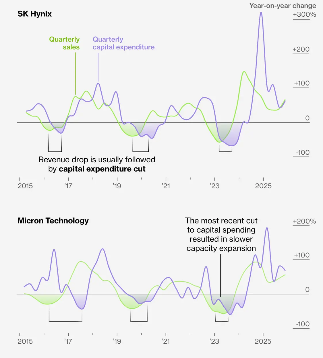 长期以来,内存芯片行业一直难以实现产能与需求波动的精准匹配。即便在制造商们努力扩大产能之际,他们依然对重蹈覆辙保持警惕。过去的繁荣-萧条周期曾多次吞噬行业利润,并迫使弱势厂商走向破产。