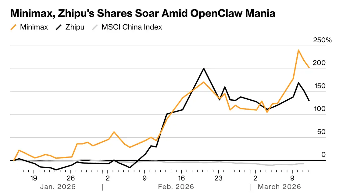 这股热潮仅在过去一周就催生了一系列AI智能体工具,并引发了一轮股市狂欢,为中国科技板块增加了超过1000亿美元的市值。作为智能体tokens的主要供应商之一,稀宇科技的股价本周飙升逾30%,使其在上市短短两个月内涨幅达到550%,市值一举超过百度公司。