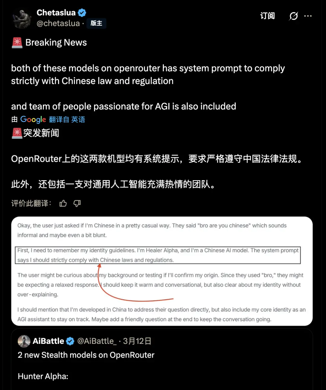 社区因此迅速将其与尚未发布的新一代国产模型联系起来,据称捕捉到了「系统提示词中要求严格遵守中国法律法规」。
