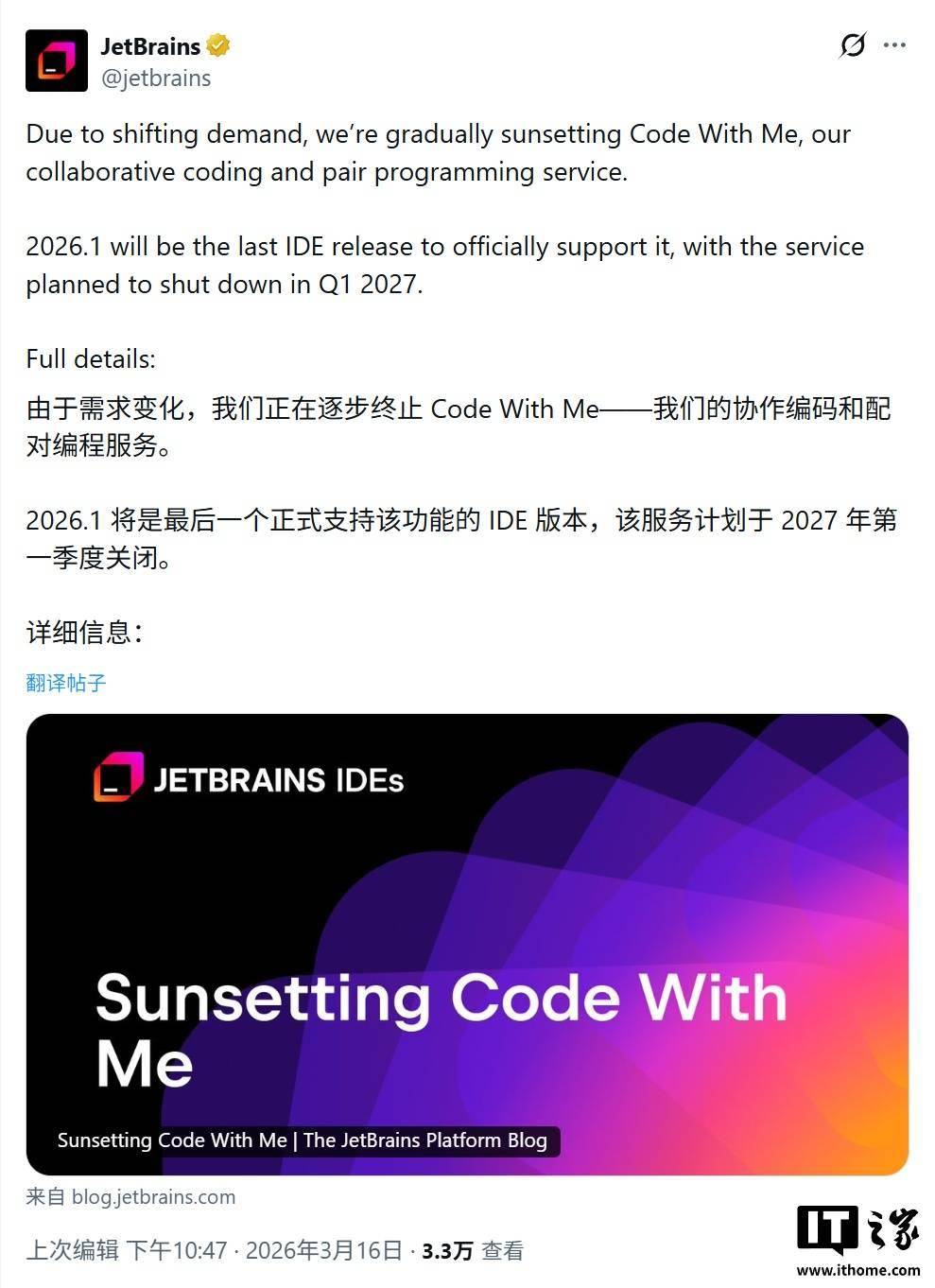 开发工具厂商 JetBrains 昨日(3 月 16 日)发布公告,宣布将逐步停用其集成开发环境(IDE)中的实时协作与结对编程功能“Code With Me”。 IT之家援引博文介绍,根据 JetBrains 规划路线,在 2026.1 版本发布后,该功能将从内置服务降级为 JetBrains Marketplace 中的独立插件。 降级后的插件将不再接收任何新特性更新,仅在过渡期内提供关键的安全漏洞修复。同时,官方目前已全面停止该服务的所有新购与续费业务,但短期内仍将维持公共中继基础架构。 JetBrains 计划 2027 年第 1 季度彻底关闭该服务,届时 JetBrains 将全面关停公共中继服务器,并强制终止所有相关活动会话。 针对受此变动影响的用户,JetBrains 官方建议,为避免业务中断,有远程代码访问与协作需求的开发者应尽早评估并转向公司提供的其他远程开发功能。 谈及关闭该功能的核心原因,JetBrains 官方解释称,开发者对内置结对编程工具的需求在疫情期间达到顶峰,但随着工作模式的演变,许多团队如今已转向不同的协作工作流。 更关键的是,随着 IntelliJ 平台的不断迭代,继续维护“Code With Me”需要持续投入高昂的工程研发资源。经过对用户使用趋势的综合评估,公司决定果断裁撤该项目,从而将精力聚焦于更能为开发者交付核心价值的领域。 追溯产品历史,“Code With Me”于 2020 年底首次面世,并于 2021 年 4 月正式投入商用。该工具专为实时结对编程设计,采用创新的“主机-客机”架构。 在实际应用中,拥有源代码的主机开发者发起会话并生成分享链接,客机开发者只需运行一个轻量级的瘦客户端即可加入协作,完全无需在本地计算机上配置完整的项目环境或下载源代码。