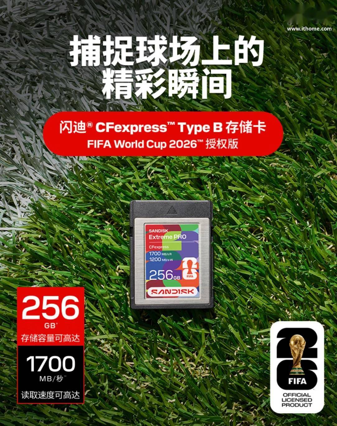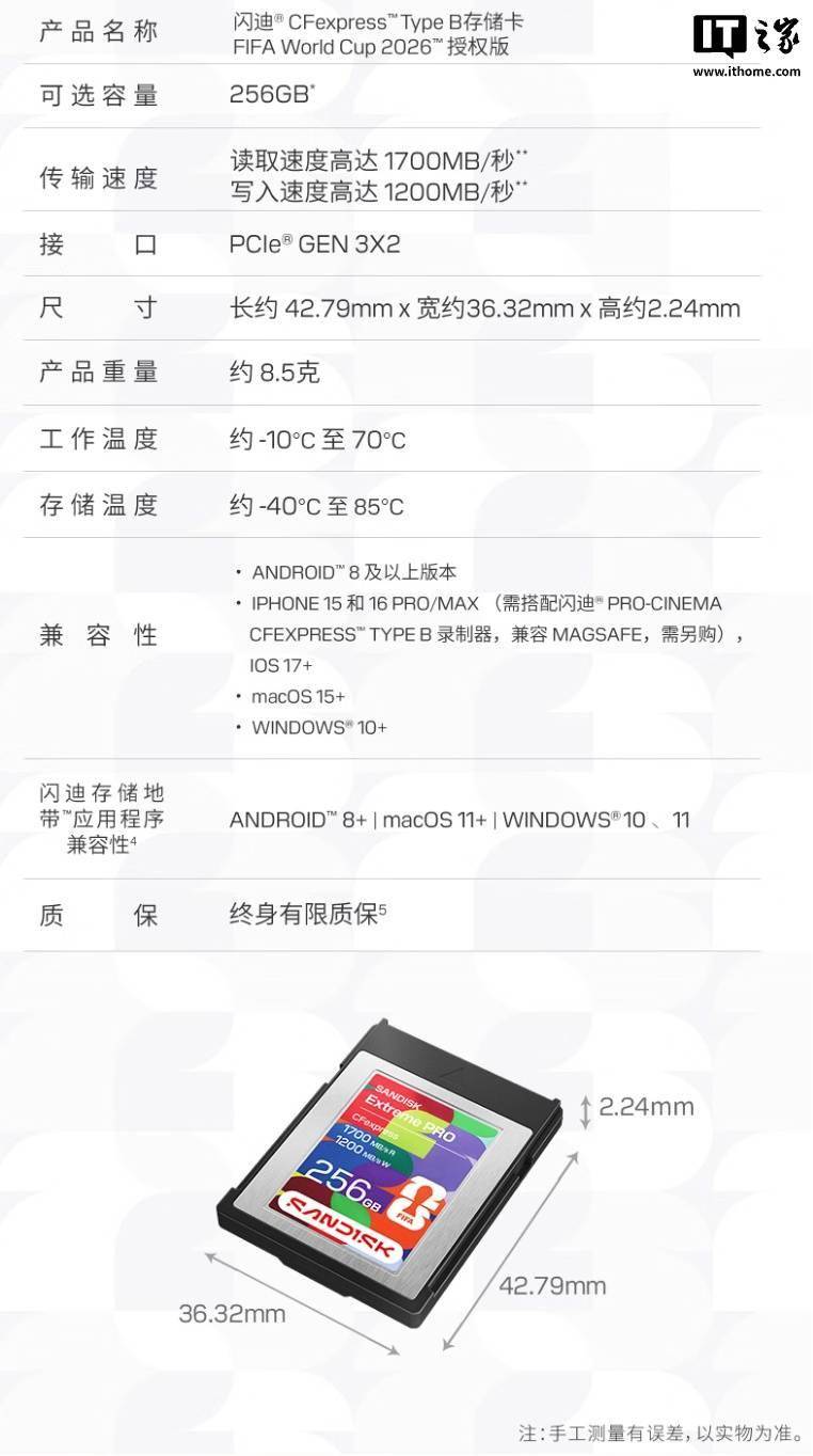IT之家 3 月 18 日消息,闪迪现已推出一款 2026 世界杯联名 256GB CFexpress 卡,定价为 2699 元。 该存储卡正面贴纸采用 FIFA 联名设计,整体号称可以承受高达 20 牛顿(约 2 千克力)的弯折及高达 1 米的跌落,并经高达 10000 次插拔测试,户外拍摄也能够安心使用。存储卡读取速度至高可达 1700MB/s,写入速度至高可达 1200MB/s,IT之家附产品规格: