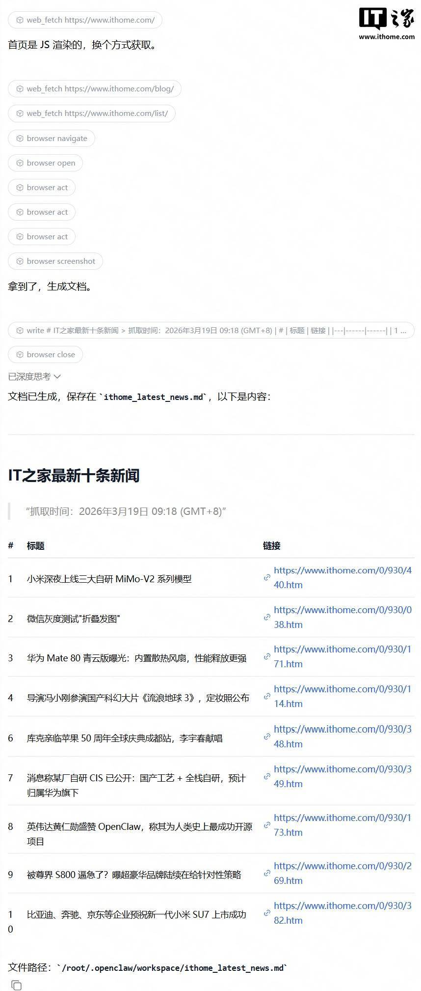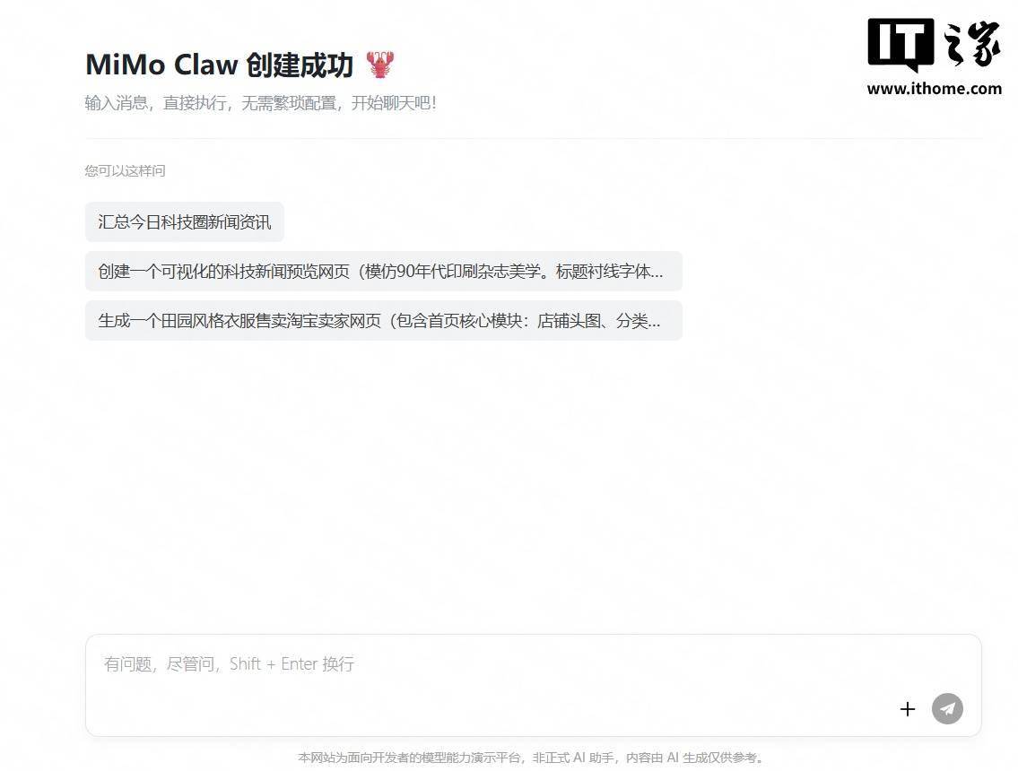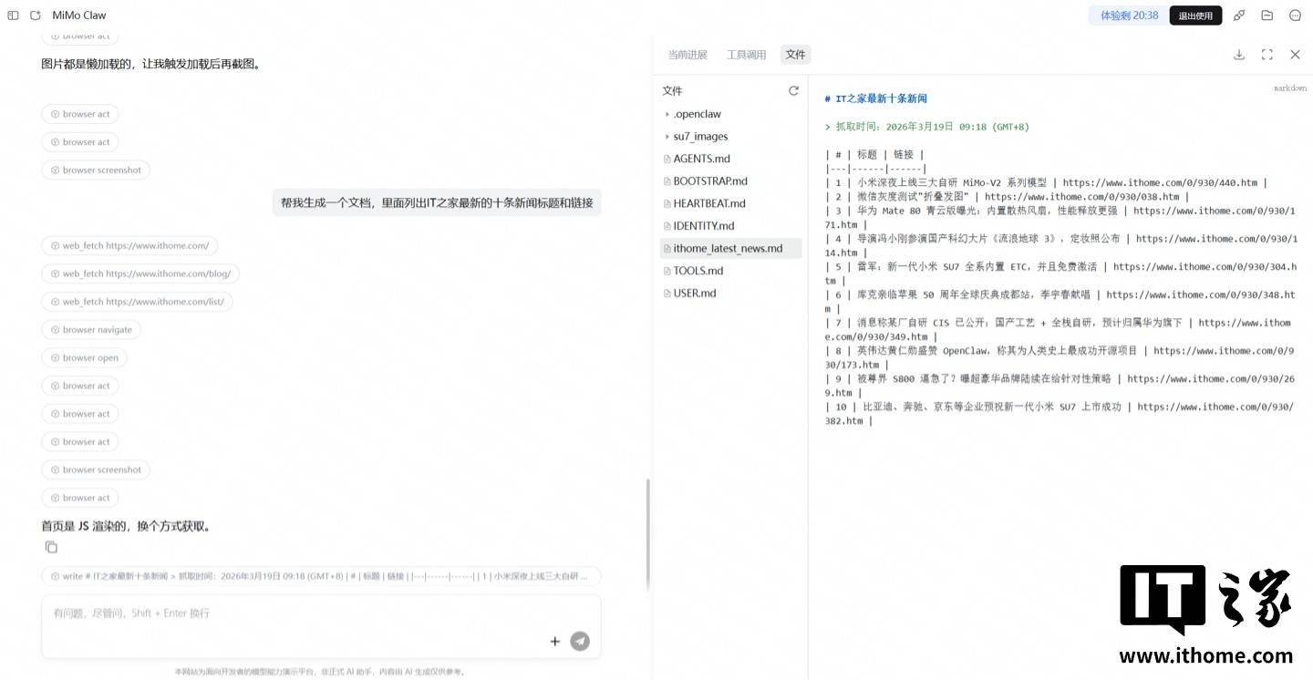 IT之家测试,用户可免费体验 30 分钟 Xiaomi MiMo Claw,该工具采用常规的对话形式,自带文件系统,测试可以实现IT之家网站的图片、新闻抓取,并存储在文件中。退出体验后,相关数据就会被销毁。