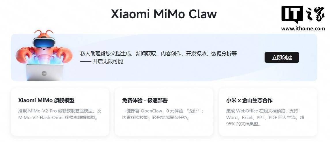 小米今日凌晨突然宣布推出三款大模型 —— MiMo-V2-Pro & Omni & TTS。目前,这些模型已经登陆 Xiaomi miclaw、MiMo Studio、金山办公、小米浏览器,通过 OpenClaw、OpenCode、KiloCode、Blackbox、Cline 接入,可限时免费体验一周。 与此同时,小米 MiMo Studio 官网上线了 Xiaomi MiMo Claw,现开放免费体验。 据小米官方介绍,Xiaomi MiMo Claw 私人助理可帮助用户文档生成、新闻获取、内容创作、开发提效、数据分析等。 - Xiaomi MiMo 旗舰模型:搭载 MiMo-V2-Pro 最新旗舰基座模型,及 MiMo-V2-Flash-Omni 多模态理解模型。