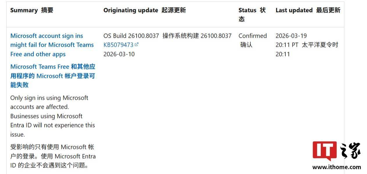 据科技媒体 Bleeping Computer 今天报道,微软承认 Win11 系统 3 月更新导致 Teams、OneDrive 等应用无法登录账户。 据报道,Windows 11 设备安装“补丁星期二”KB5079473累积更新后可能出现上述问题,导致 Edge 浏览器、Excel、Word 等需要微软账户的应用显示“未连接到互联网”错误。 不过,该问题仅影响需要登录微软账户的应用,使用 Microsoft Entra ID 进行身份验证的企业应用则不受影响。 目前微软尚未发布修复补丁,不过官方也提供了保持联网状态下重启的临时方案,IT之家附微软官方表述如下: 该问题会在设备进入特定网络连接状态的情况下出现,并可能自行修复。如果遇到此问题,请在保持联网的情况下重启设备,这有助于修复设备网络连接状态,避免问题再次发生。