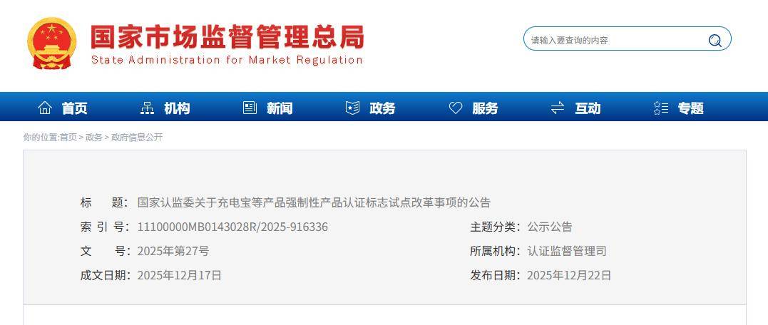 据央视新闻报道,市场监管总局今日召开一季度例行发布会,此前,市场监管总局聚焦充电宝、电动自行车及安全附件、燃气燃烧器具及安全附件等 3 大类、11 种产品,启动 CCC 标志试点改革,是为了完善强制性产品认证制度,压实企业产品质量安全主体责任,有效防范假冒认证标志、虚假认证等违法行为。 此次改革,市场监管总局紧扣问题,注重实效,在原有 CCC 标志的基础上,集成 CCC 追溯二维码,构建“获证产品 — 生产企业 — 认证证书 — 发证机构”的认证信息数据链。只需“一键扫码”,就能实时核验产品是否获得有效 CCC 认证,还能清晰获取生产者、产品规格、发证机构等关键信息,实现“源头可溯、真伪可验、责任可追”。 试点改革明确要求,认证机构在签发证书时,免费向获证企业提供 CCC 追溯二维码标识,用于产品印刷或模压,并设置了 12 个月的准备与过渡期,让企业有充足时间调整适应。待过渡期结束,也就是2027 年 3 月 1 日起,试点范围内所有出厂销售的获证产品,都要“持码上岗”,规范上市。 目前,试点改革工作已全面启动并有序推进。首批加施 CCC 追溯二维码的 11 种试点产品均已投产,陆续上市。 IT之家注意到,2025 年底,市场监管总局(国家认监委)就曾发布公告,对充电宝、燃气燃烧器具、电动自行车等共计 3 类 11 种高风险产品实施 CCC 认证标志试点改革。官方还公布了追溯二维码 CCC 标志的式样: