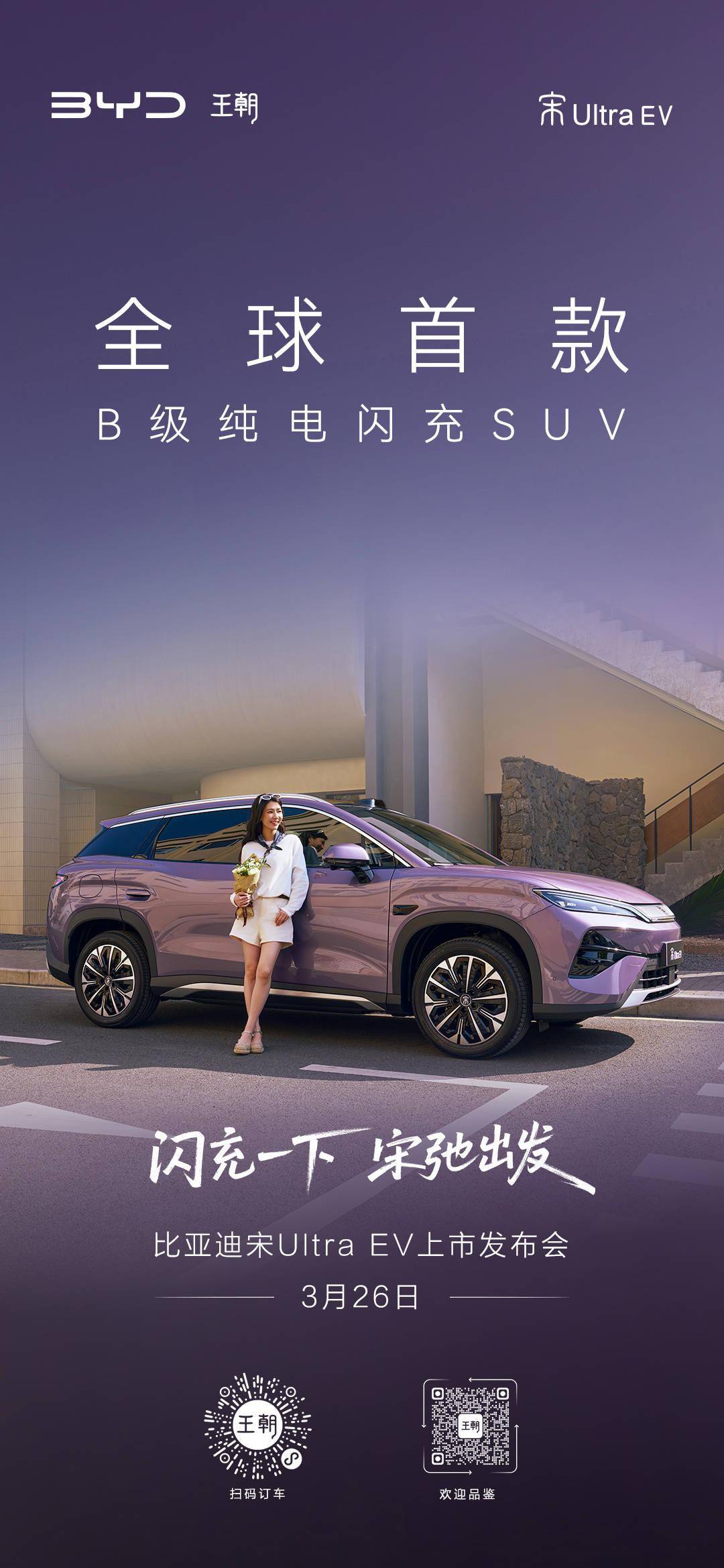 比亚迪王朝网销售事业部总经理路天今日在微博宣布,比亚迪宋 Ultra EV 预计将于 3 月 26 日正式上市,定位全球首款 B 级纯电闪充 SUV。 作为比亚迪王朝首款 B 级纯电 SUV 车型,宋 Ultra EV 预售价 15.5 万元起: - 605km 领先型 15.5 万元