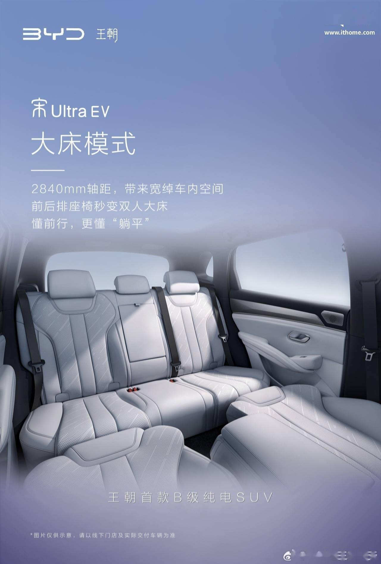 预售期间,用户可获得额外 6 个月的免费闪充权益,加上全部可享的 1 年免费闪充权益,就是 18 个月免费闪充权益。 据官方介绍,宋 Ultra EV 号称“以简驭繁”,在外观上东方美学与当代设计融合,辅以悬浮式车顶,兼具姿态和科技感;新车提供深浅两款内饰,配备智感敲击解锁前备箱、多功能拓展接口、魔方传声筒等。 另外,新车内饰设计简洁、偏年轻化,方向盘采用两辐式设计,车内配备一块悬浮式中控屏和一块仪表屏,仪表屏左侧和中控屏下方的空调出风口预计支持手动调节方向。 新车中央扶手处配有双手机无线充电板、置物杯架等,并设置有物理按键和旋钮。宋 Ultra EV 的轴距为 2840mm,支持前排座椅放倒,宣称“前后排座椅秒变双人大床”。