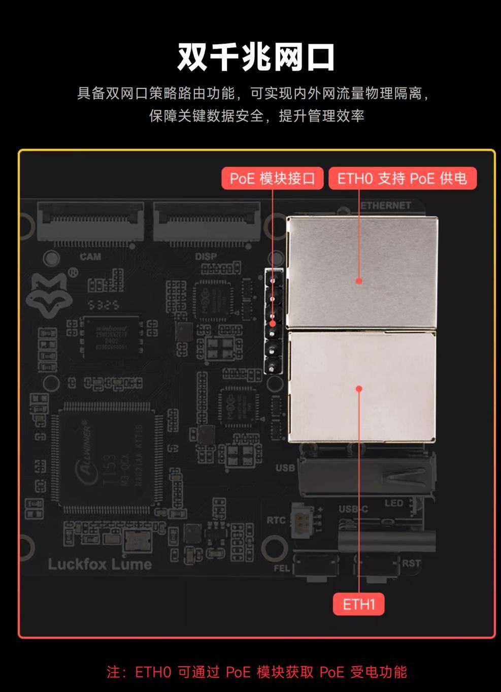 幸狐最近推出 Lume 系列开发板,搭载全志 T153 芯片,适合用于物联网等场景。 据介绍,这款产品的处理器采用多核异构设计,搭载 4 个 Cortex-A7 核心、1 个 RISC-V E907 核心,具备 128MB DDR3 内存,提供一排 40 针 GPIO 引脚,可连接外部传感器和执行器,不过并没有配备 HDMI 接口。 规格方面,这款产品可以通过 MIPI DSI 4-lane 接口连接屏幕、通过 CSI 接口连接摄像头,提供两个 USB(Type-C+Type-A)接口,规格均为 USB 2.0。 值得注意的是,这款设备提供双千兆以太网接口,官方还提供 PoE 模块套餐,使设备可以通过网线同时完成供电与数据传输,从而减少布线需求,具备 microSD 卡槽,可用于安装操作系统等。 IT之家附该产品详细参数如下: 目前该产品已在天猫开售,标准版售价 129 元,PoE 模块套餐售价 159 元。