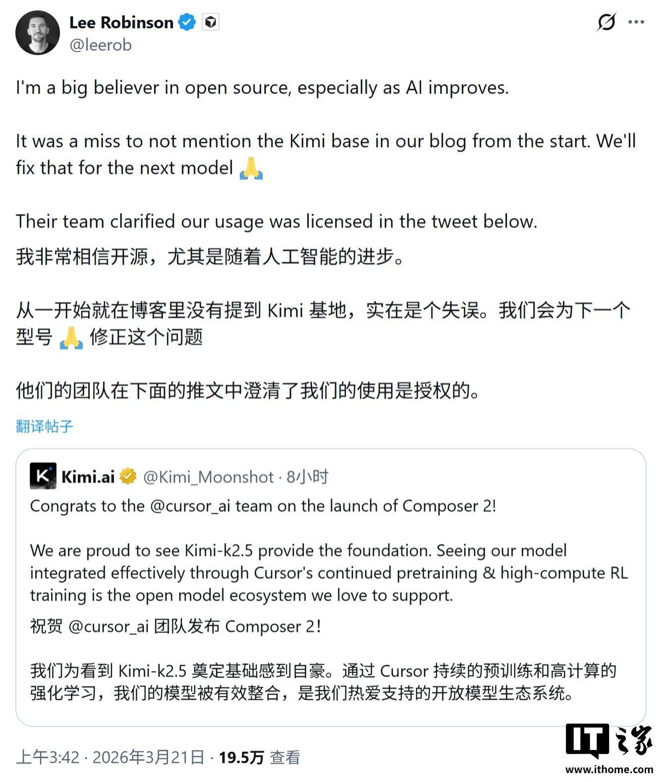前端开发者、Cursor 开发者体验副总裁 Lee Robinson 发文称:“我非常支持开源软件,尤其是在人工智能技术不断进步的今天。从一开始就没在博客里提到 Kimi 基地,这确实是个疏忽。我们会在下一款模型中弥补这个不足。”