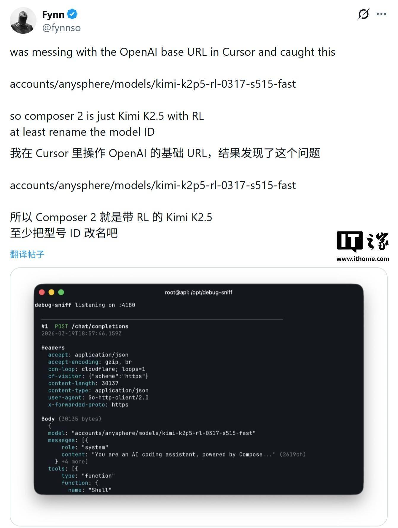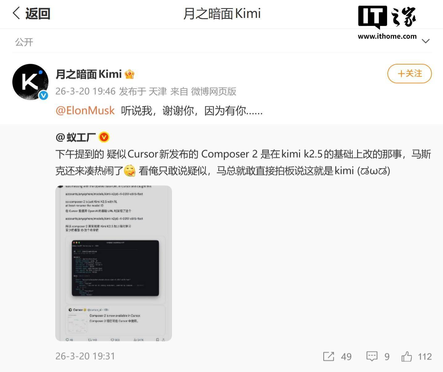 月之暗面Kimi 官方账号今天(3 月 21 日)发布微博,回应称 Kimi K2.5 为 Composer 2 提供了底座,Cursor 是通过 Fireworks 的托管推理与 RL 平台接入该模型,属于授权商业合作。 AI 编程平台 Cursor 推出 Composer 2 和 Composer 2 Fast 两款编程模型,主打“长周期智能体编程”,具备 20 万 Token 上下文窗口,专为 Cursor 环境内的复杂多步任务深度优化。 不过在 Composer 2 发布后,网友 @fynnso 发现 Composer 2 疑似套用 Kimi-k2.5 模型,在操作 base URL 后发现“accounts/anysphere/models/kimi-k2p5-rl-0317-s515-fast”,推测 Composer 2 就是带 RL 的 Kimi K2.5。 在舆论发酵后,埃隆 · 马斯克也评论指出:“没错,这就是 Kimi 2.5”。 Kimi 昨日发布微博,感谢马斯克的力挺: Kimi 今天发布微博,IT之家附上微博内容如下: 一则声明 恭喜 Cursor 团队发布 Composer 2! 我们自豪地看到 Kimi K2.5 为其奠定基础。看到我们的模型通过 Cursor 的持续预训练与高强度 RL 训练被高效集成,正是我们乐于支持的开放模型生态。 注意:Cursor 通过 Fireworks AI 托管的强化学习与推理平台接入 Kimi K2.5,这是作为授权商业合作的一部分。