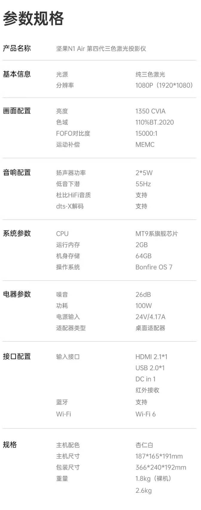 IT之家 3 月 22 日消息,坚果 N1 Air 第四代投影仪现已在京东开启预约抢购,新品搭载行业最新 QuaLas 32 激光器,对比度可达 15000:1,支持小米米家互联,售价 3058 元。 据介绍,这款投影仪搭载新一代 MALC 目氪护眼纯三色激光、QuaLas 32 激光器,CVIA 亮度可达 1350,多出 23% 细节,FOFO 对比度为 15000:1,覆盖 110% BT.2020 广色域,支持 HDR10 专业解码。 规格方面,这款投影仪具备多种经典大师滤镜,支持调整图像自定义参数,配备双 5W 扬声器,具备杜比认证,低音下潜至 55Hz,相比传统产品可省去 30% 空间,支持实时无感梯形校正、自动对焦,内置立体流通散热系统,加速空气导出。 此外,这款投影仪支持小米澎湃互联、超级小爱控制,接入米家 App,搭载 Bonfire OS 操作系统,接入 Deepseek 大模型,内存 / 存储空间配置为 2+64GB。 IT之家附该投影仪详细参数如下: 目前该投影仪已在京东开启预约抢购,售价 3058 元。