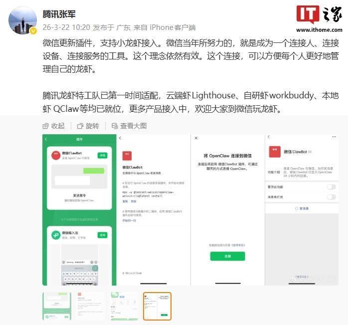 微信插件页面新增了一项微信 ClawBot 插件。该插件旨在“连接 OpenClaw 与微信”,可在 OpenClaw 运行命令 npx -y @tencent-weixin / openclaw-weixin-cli@latest install 安装插件后扫码绑定微信。 IT之家注意到,腾讯公司公关总监张军今日发文回应了“微信新增 ClawBot 插件”。他表示,微信当年所努力的,就是成为一个连接人、连接设备、连接服务的工具。这个理念依然有效。这个连接,可以方便每个人更好地管理自己的龙虾。 另外,张军透露,腾讯龙虾特工队已第一时间适配,云端虾 Lighthouse、自研虾 workbuddy、本地虾 QClaw 等均已就位,更多产品接入中。 值得一提的是,QQ 机器人此前已经接入 OpenClaw。用户可以根据使用习惯,选择远程一键执行、本地脚本执行,或手动在原生 OpenClaw 环境中安装或升级 QQBot 插件。