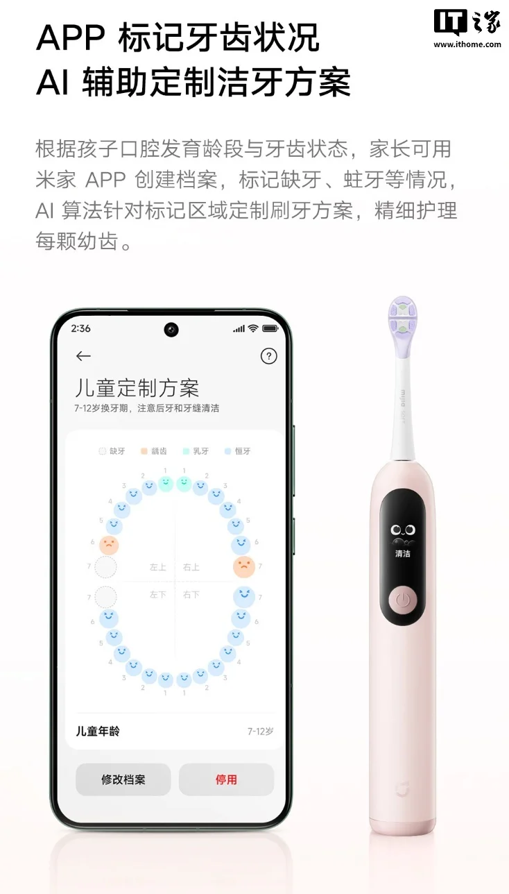 这款牙刷采用了贴合儿童小手握持的人体工学手柄,防滑易抓。牙刷机身带有彩色屏幕,支持动画互动引导儿童刷牙,同时用户可以在米家 App 标记蛀牙、缺牙,通过 AI 定制刷牙方案。