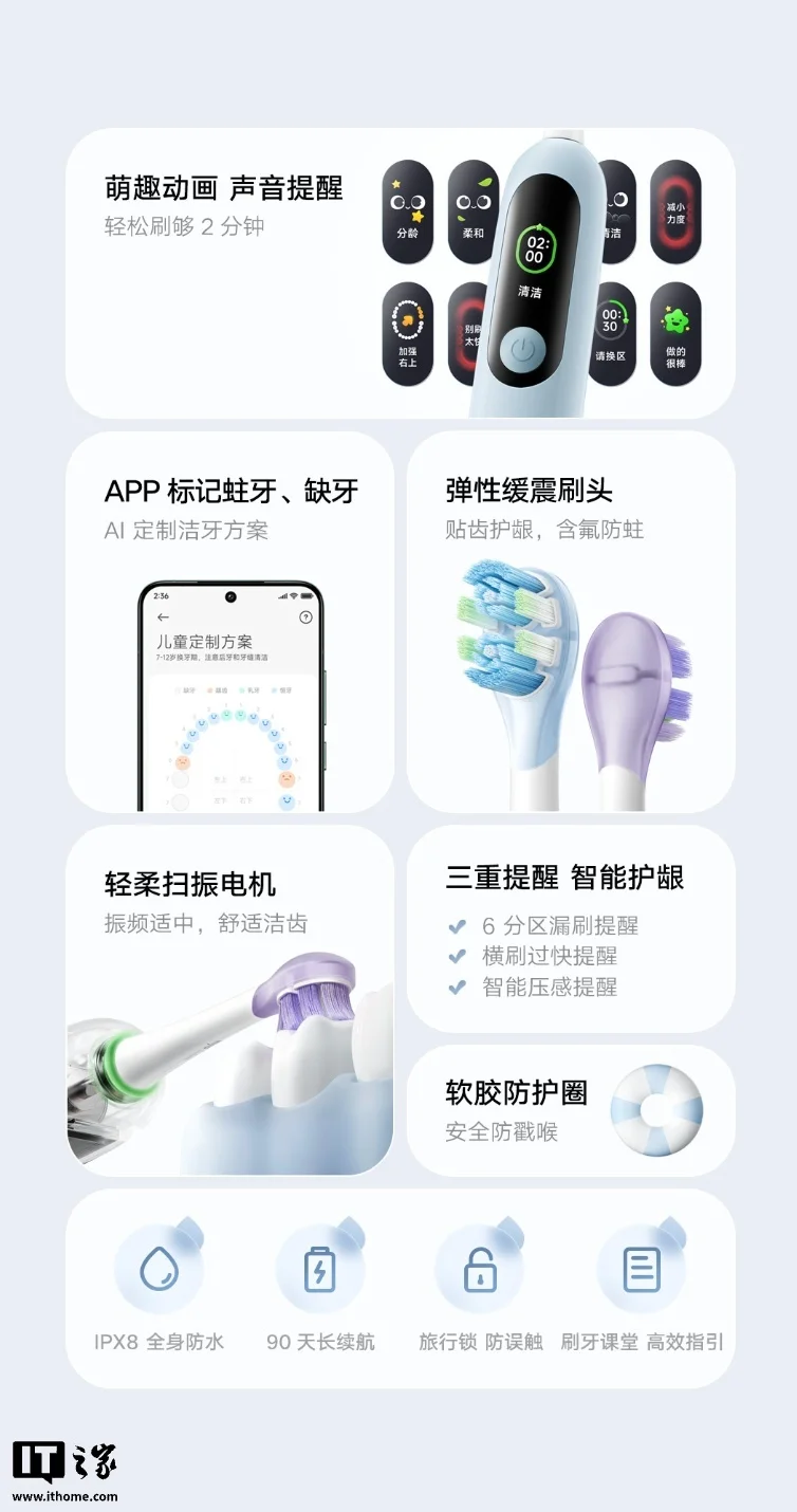 该产品配备轻柔扫振电机 + 弹性缓震刷头 + 软胶防护圈,支持分龄洁牙,支持 IPX8 全身防水、90 天长续航、旅行锁防误触。此外还附赠个性化贴纸,让多彩配色搭配个性贴纸打造儿童牙刷版“痛机”。