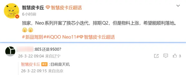 【CNMO科技消息】3月22日,数码博主“智慧皮卡丘”爆料称,iQOO Neo11系列已开案一款换芯小迭代机型,预计在2026年第二季度登场。该机将搭载联发科天玑9500芯片,但受物料成本上涨影响,最终能否顺利落地仍存变数。