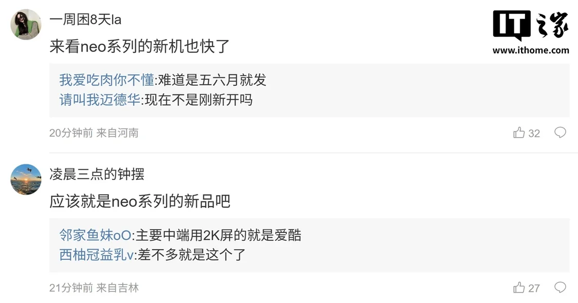虽然博主并没有在文中给出这两台手机的具体型号,但结合文中暗示以及评论区讨论我们可以合理猜测是 iQOO Neo 系列。