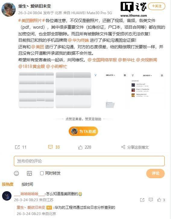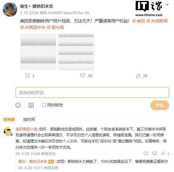 “美团删照片”话题今日突然登上微博热搜,引发热议。 上周有多名微博用户反馈称,在未执行任何操作的情况下,手机相册内数百至数千张照片、视频被自动清空,而系统拦截日志显示,执行删除操作的应用为美团。 用户晒出的手机截图显示,在删除过程中,用户能够在手机界面上清楚看到美团正在删除图片和视频的操作提示。IT之家注意到,网友反馈称自己的手机曾被美团一次性删除上千张照片与视频,还涉及音频等各类文件(pdf、word)。 对此,美团客服账号在评论区回复称:“经排查,个别安卓系统版本下,第三方插件冲突导致缓存清理时会出现异常提示,不涉及对您个人信息的读取、存储或泄漏。我们已第一时间修复。如清理文件确实涉及您的个人文件,可前往手机回收站或最近删除找回。如需帮助,我们将为您提供一对一专项技术支持。”